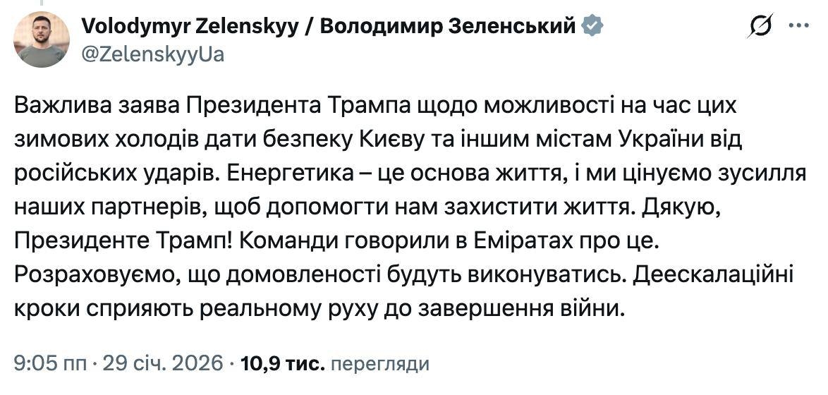 "Важлива заява Президента Трампа щодо можливості на час цих зимових холодів дати безпеку Києву та іншим містам України від російських ударів. Енергетика – це основа життя, і ми цінуємо зусилля наших партнерів, щоб допомогти нам захистити життя. Дякую, Президенте Трамп! Команди говорили в Еміратах про це. Розраховуємо, що домовленості будуть виконуватись. Деескалаційні кроки сприяють реальному руху до завершення війни", — написав президент в соцмережах.