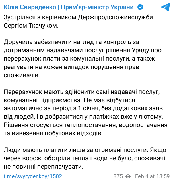 Про доручення щодо перерахунку платежів за комунальні послуги Юлія Свириденко повідомила у своєму Telegram-каналі 4 лютого за результатами зустрічі з керівником Держпродспоживслужби Сергієм Ткачуком. За її словами, служба має забезпечити нагляд і контроль за виконанням надавачами житлово-комунальних послуг рішення Кабінету міністрів України про перерахунок плати за комунальні послуги.