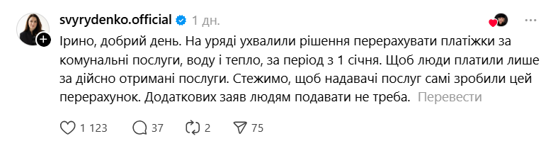 Нагадаємо, ще 4 лютого прем'єр-міністерка України Юлія Свириденко заявила, що доручила простежити за перерахунком комунальних платежів для людей, у яких через російські обстріли не було води чи тепла. За її словами, українці мають платити лише за фактично надані послуги.