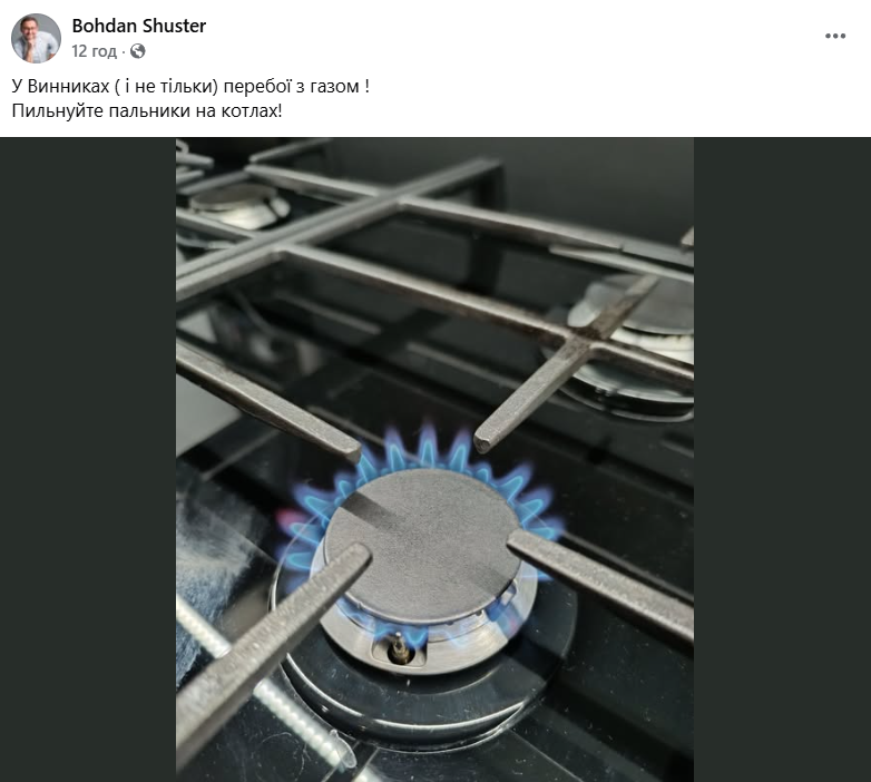 "У Винниках (і не тільки) перебої з газом! Пильнуйте пальники на котлах!" — написав він у Facebook.