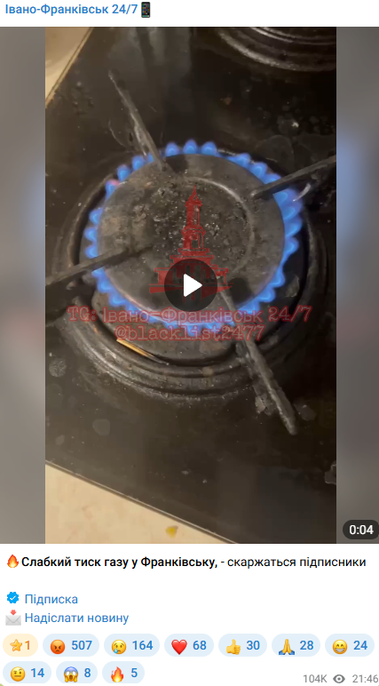 На перебої з газом в Івано-Франківську поскаржилися підписники Telegram-каналу "Івано-Франківськ 24/7" ввечері 8 лютого. Також паблік "Типовий Львів" писав про понижений тиск в будинках у місті Винники Львівської громади та навколишніх населених пунктах.