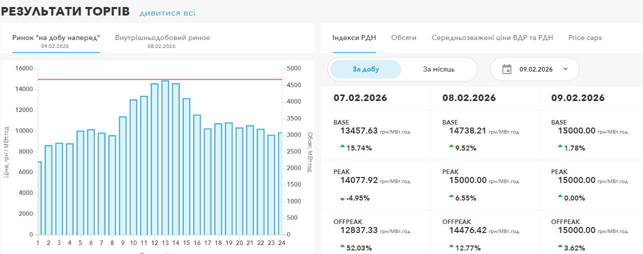 9 лютого вартість електроенергії вперше сягнула 15 гривень за кВт/год для промислових споживачів без урахування податку.