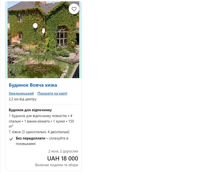 У Хмельницькому на період Дня святого Валентина доступний лише один варіант будинку під назвою "Вовча хижа", який коштує 18 000 грн. Гостям пропонують доступ до саду, тераси та приватного басейну. А якщо взимку такий сервіс закоханим нідочого, у місті можна знайти більш практичні варіанти. Наприклад, у одному з готелів двомісний номер категорії "делюкс" обійдеться близько 1 600 грн.