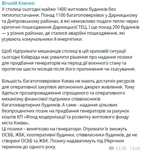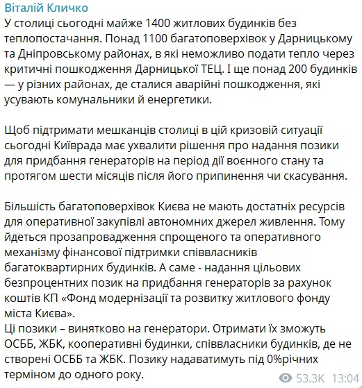 "Щоб підтримати мешканців столиці в цій кризовій ситуації, сьогодні Київрада має ухвалити рішення щодо надання позики для придбання генераторів на період дії воєнного стану та протягом шести місяців після його припинення або скасування", — написав він уже у себе в соцмережах.