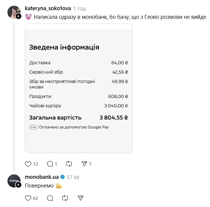 Натомість на її скаргу підтримка Glovo повернула лише 1171,44 грн, та пояснила, що решту суми "технічно не можуть" повернути.