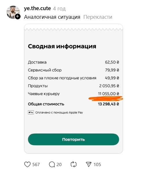 Кур'єр Glovo пояснив, що гігантські чайові вони не отримали