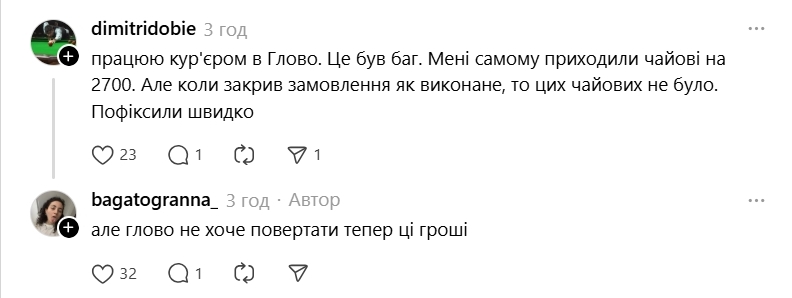 Також відписався кур'єр Glovo, який зазначив, що хоча гроші списувались, як "чайові", кур'єри їх не отримали: "Працюю кур'єром в Глово. Це був баг. Мені самому приходили чайові на 2700. Але коли закрив замовлення як виконане, то цих чайових не було. Пофіксили швидко".