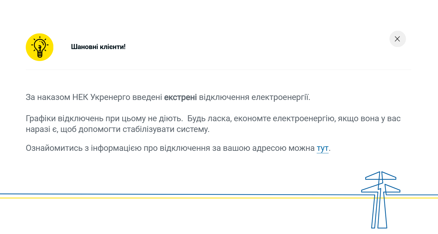 Актуальну інформацію щодо відключень за конкретними адресами можна перевіряти на сайті ДТЕК або в чат-боті.