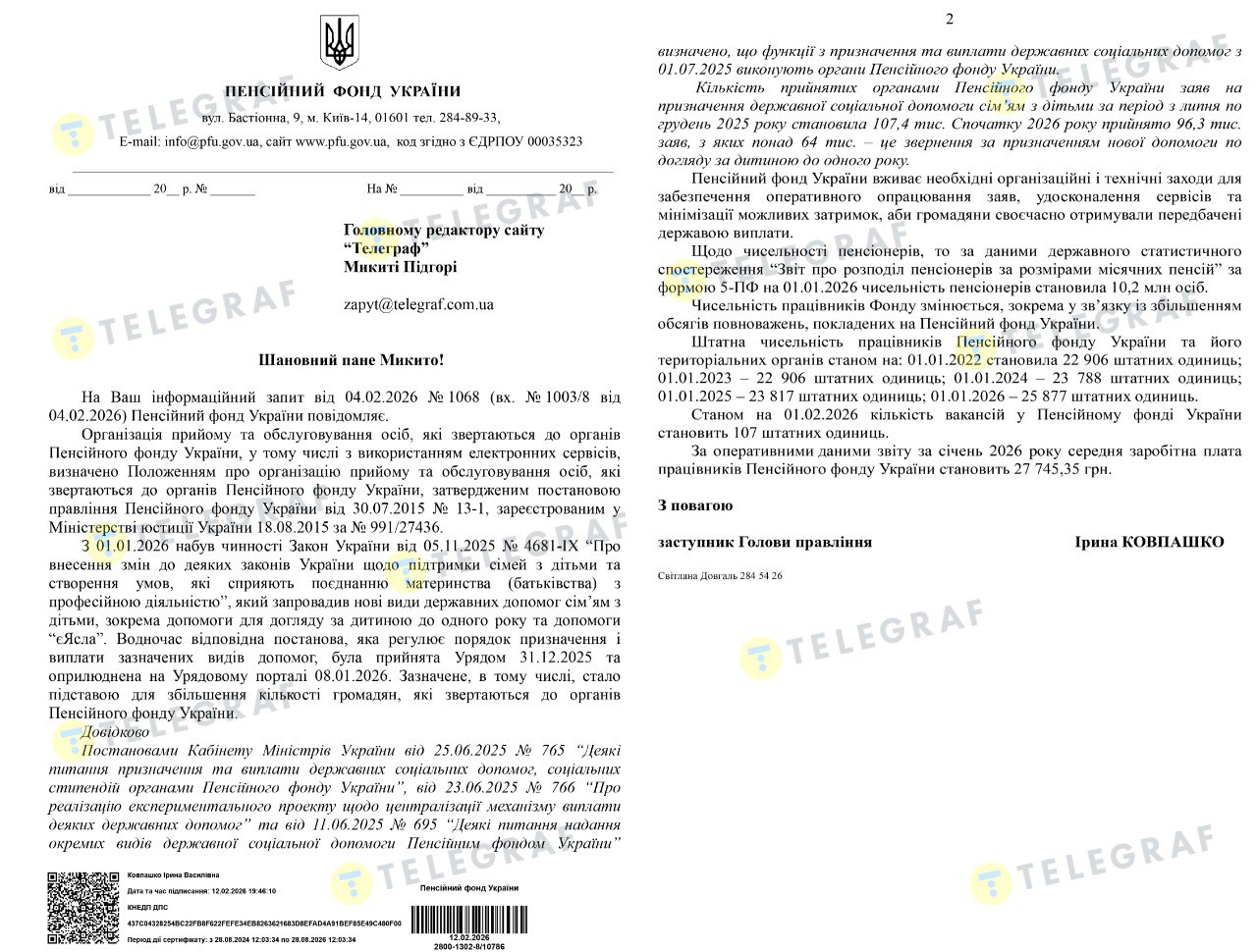 Також журналісти відзначили нестачу працівників у Пенсійному фонді. Якщо у 2020 році в установі працювало 47 тисяч людей, то на початку 2022-го, згідно з відповіддю на запит, їх було вже близько 23 тисяч. В лютому 2026 року кількість співробітників ПФУ становить 25 877 людей, а кількість вакансій — 107. При цьому з липня 2025 року на Пенсійний фонд було покладено більше повноважень: окрім пенсій, його співробітники стали займатися соціальними допомогами.