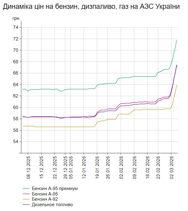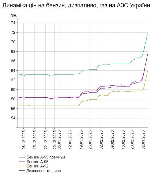 Ще до початку війни в Ірані ціни на бензин в Україні демонстрували зростання, однак це були переважно помірні коливання. Тоді як 2 березня ситуація різко змінилася: ринок відреагував стрибком вартості, і оператори АЗС оперативно встановили нові цінники на пальне.