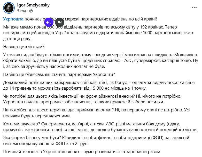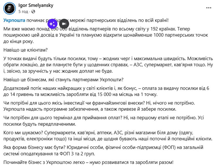 За словами гендиректора поштового оператора Ігоря Смілянського, у 192 країнах уже діють понад 690 000 відділень партнерів, і тепер настала черга поширити цю практику і в Україні.