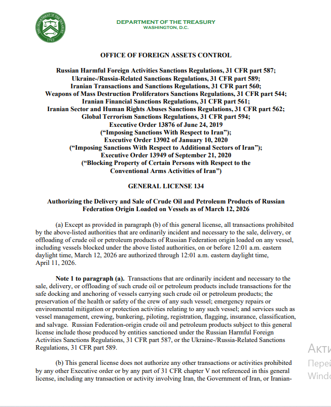"Управління з контролю за іноземними активами (OFAC) Міністерства фінансів США видає загальну ліцензію 134, пов'язану з Росією, "Про дозвіл на поставку та продаж сирої нафти та нафтопродуктів походженням з Російської Федерації, завантажених на судна станом на 12 березня 2026 року", — йдеться у повідомленні Управління.