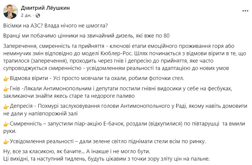 Льоушкін іронічно порівняв реакцію влади та суспільства на подорожчання бензину з відомою психологічною моделлю Кюблер-Росс, яка описує етапи прийняття неминучих змін. За його словами, спочатку ринок пройшов стадію заперечення, потім — гніву, далі — депресії, а зараз фактично дійшов до прийняття підвищення цін бензин.