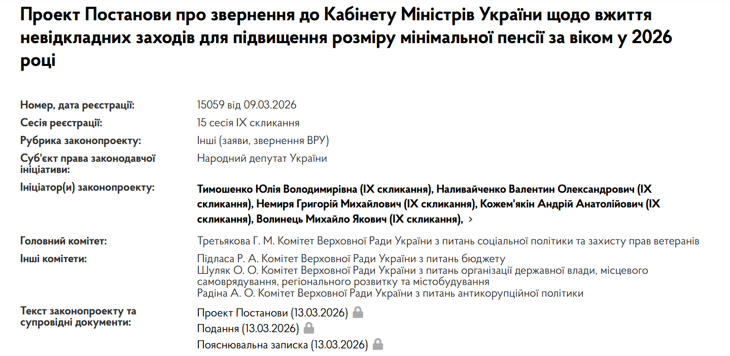 В Українському парламенті 9 березня було зареєстровано проект постанови про звернення до Кабінету міністрів щодо вжиття невідкладних заходів для підвищення розміру мінімальної пенсії за віком у 2026 році. Про це йдеться у картці законопроекту №15059.