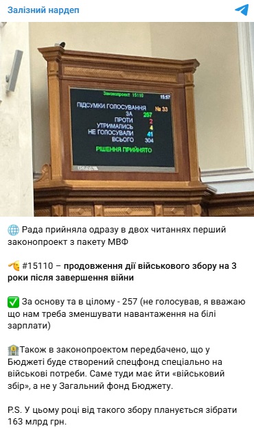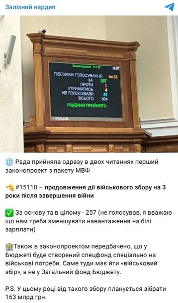 7 квітня Верховна Рада України ухвалила за основу та в цілому внесений Кабінетом Міністрів України законопроєкт щодо справляння військового збору.