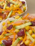 Кукурудзу висипати спочатку на сито, щоби з неї пішла вся зайва рідина. Аналогічно зробити з ананасами. Нарізати ананас.
