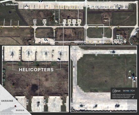 Російські війська бояться ударів американськими балістичними ракетами ATACMS по аеродромах і спішно ховають авіатехніку. Судячи із супутникових знімків, які показав військовий аналітик Брейді Афрік, з тимчасово окупованого Бердянська до Таганрога вже перемістили 21 вертоліт.
