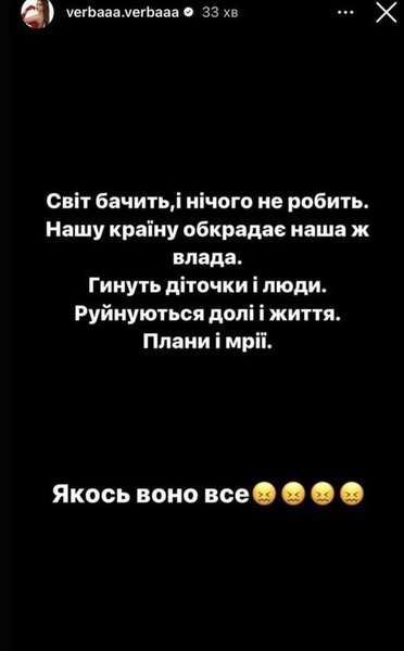 "Світ бачить і нічого не робить. Нашу країну обкрадає наша ж влада. Гинуть дітлахи і люди. Руйнуються сім'ї та життя. Плани і мрії", — йдеться в одній з її сторіс.
