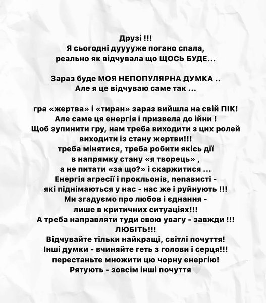 "Щоб зупинити гру, нам потрібно виходити з цих ролей, виходити зі стану жертви. Треба змінюватися і робити якісь дії для наближення до стану "я творець", а не питати, за що. Енергія агресії та прокляття нас же знищує... Любіть, відчувайте тільки найкращі та світлі почуття", — написала вона.