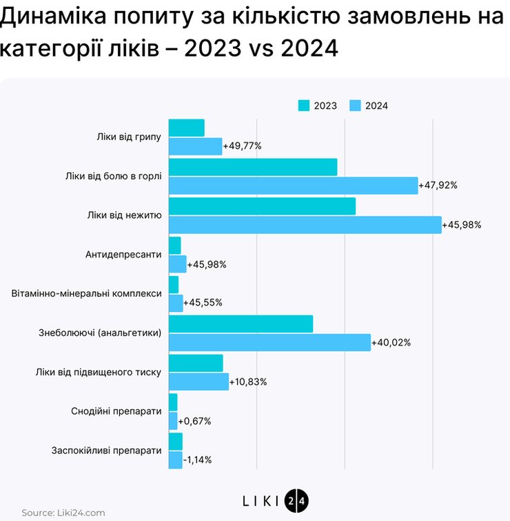 У 2024 році значно зріс попит на антидепресанти, за даними медичного порталу Liki24, збільшення становило майже 50% від торішнього рівня. Лідерами продажів фарміндустрії стали і звичайні вітаміни, їх стали брати на 45,5% більше.