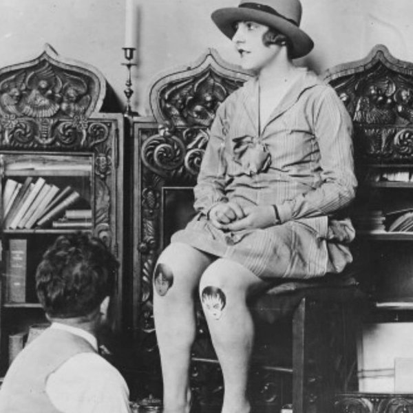 На кількох архівних фото зображені красуні в нарядах того часу, але найцікавішою на знімках є зона макіяжу. На їхніх колінах красуються малюнки у вигляді квіткових візерунків, портретів тощо. При цьому панчохи спущені трохи нижче коліна, а довжина спідниць залишає цю частину тіла відкритою.