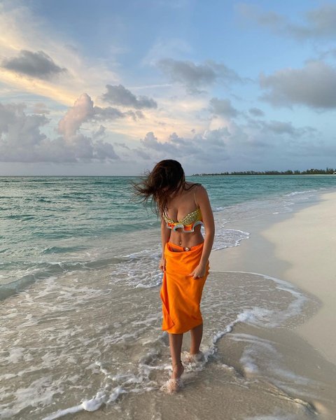 У свій день народження модель опублікувала знімок, на якому позує на березі океану в топі і бюстгальтері з камінням від Versace, а також у помаранчевій спідниці з низькою посадкою, яка дозволяє розглянути абсолютно плоский живіт Емілі без найменшого натяку на недавні пологи.