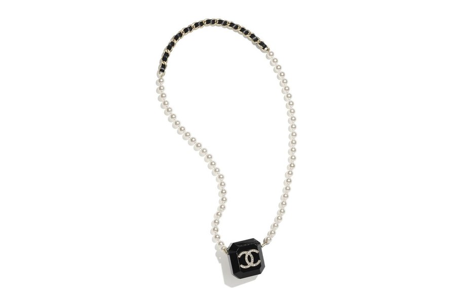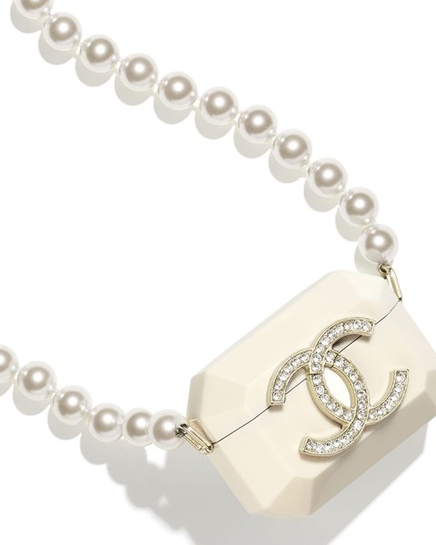 Два аксесуари виготовлені з полімерного матеріалу бежевого і чорного кольорів і прикрашені впізнаваним логотипом бренду у вигляді двох переплетених букв С. Їх можна носити як підвіски на шиї, оскільки чохли забезпечені ниткою зі скляних перлин.