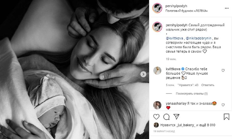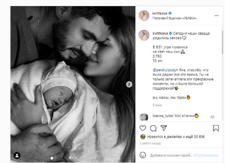 "Сьогодні наші серця народилися заново. О 9:51 ранку з'явився на світ наш син. 3.760, 56 sm", — повідомила Дар'я своїм підписникам і опублікувала перший знімок новонародженого.