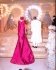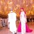 Для весільного торжества Захра обрала білу сукню до підлоги з закритими плечима в рожевих кольорах, з великим бантом на спині і такого ж кольору головним убором.