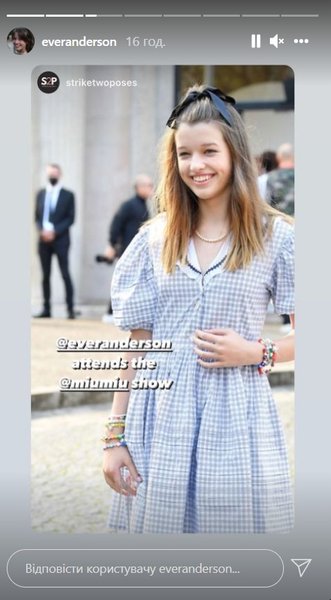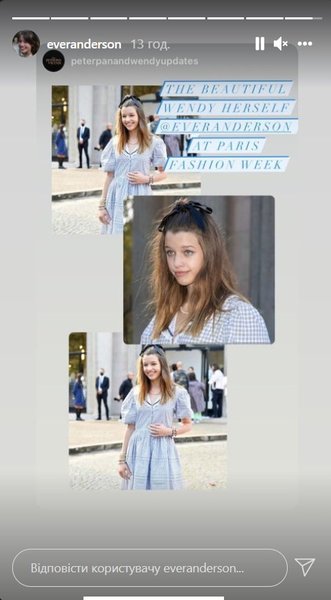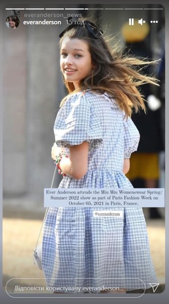 13-річна Ева Андерсон, дочка американської актриси Мілли Йовович і її чоловіка, режисера Пола Андерсона, яку називають абсолютною копією матері, була помічена на Тижні моди в Парижі. Дівчина одна з'явилася на показі Miu Miu.
