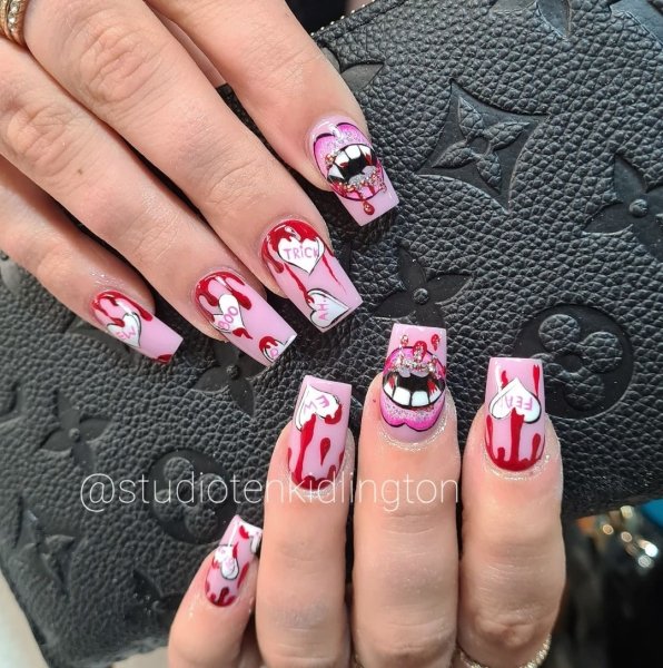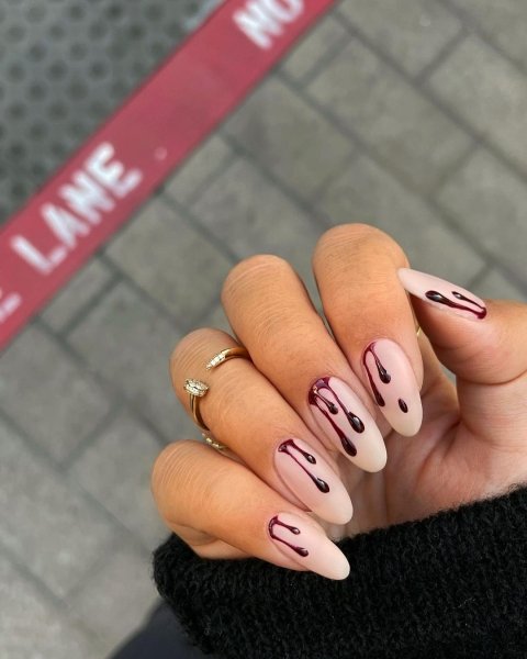 Одна зі знахідок цього сезону — вампірські нігті, коли всього два нігтики — на вказівному і мізинці, роблять загостреними. У цьому випадку, якщо зігнути пальці, створюється ілюзія вампірських іклів. Але якщо це занадто екстравагантно, то тут на допомогу прийде ще один тренд — патьоки червоного лаку, що імітують краплі крові.