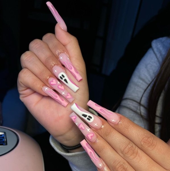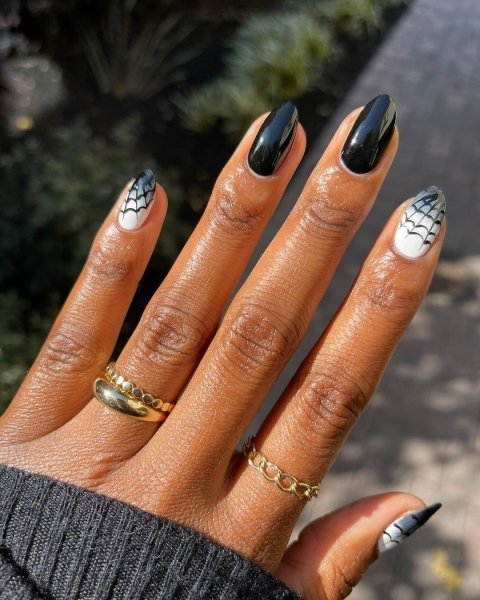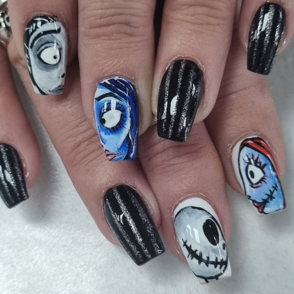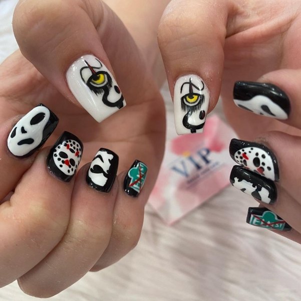 Окремо в трендах манікюру 2021 на Геловін стоїть нейл-арт. Якщо дозволяє створений образ, то модниці створюють на нігтях цілі полотна. Тематика — улюблені фільми жахів, мультфільми Тіма Бертона, популярні герої з класичних трилерів на кшталт "Геловіну", або "Крику", і багато-багато іншого.