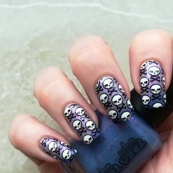 Ожилі скелети і черепи — це ще один тренд Геловіну 2021. Спочатку під скелетом малася на увазі сама Смерть. Так її зображували на стародавніх гравюрах і фресках. Зараз вони прикрашають галявини біля будинків, їх вішають на ганку. А якщо хочеться підтримати моду на "кістляву" тематику, то можна прикрасити нігті зображеннями скелетів.