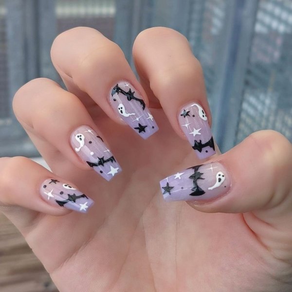 Привиди і примари — ще одна традиційна тематика на Геловін. Вбратися в добродушного привида, накинувши на себе простирадло з прорізами, найпростіше. І примарна тематика в трендах манікюру також завжди актуальна.