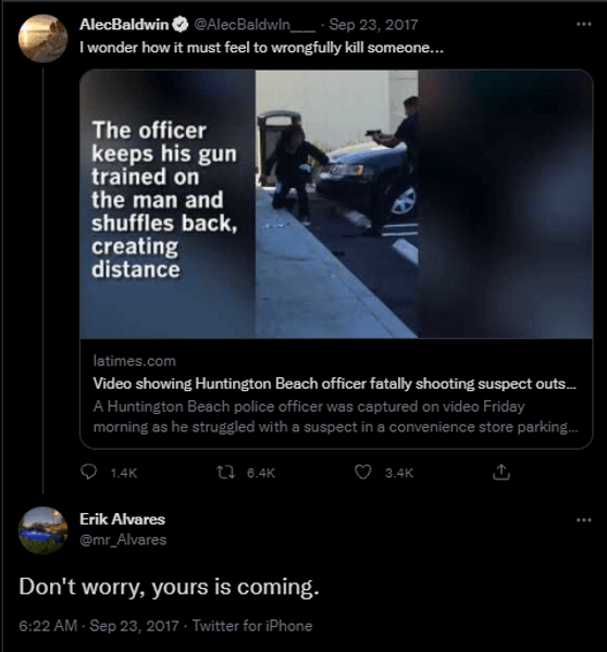 У соцмережі Twitter був виявлений твіт актора Алека Болудвіна, в якому він 4 роки тому поставив собі питання про випадкове вбивство людини. У коментарях один з користувачів відповів Болдвіну, що у нього ще "все попереду".