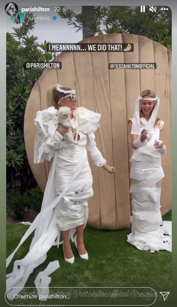 На заході знаменитість веселилася від душі в колі гостей і довела всім, що може йти під вінець практично в усьому та мати при цьому неймовірно. Йдеться про конкурс, коли учасники заходу майстрували на Періс і її невістці Тессі Гілтон весільні наряди з підручних матеріалів.