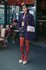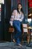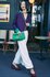 На знімку вона позує в жовтій блузі, фіолетових шортах, коричневому жакеті, накинутому на плечі, і туфлях із масивним каблуком на високій платформі. Образ доповнює сумочка бренду.
