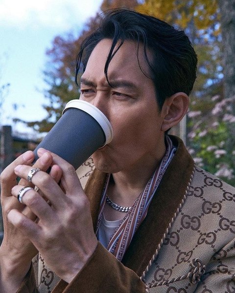 Лі Чон Чже, який став амбасадором Gucci, позував для зйомок у вбраннях цього бренду – стильних штанних костюмах, яскравому джемпері оверсайз, широких штанах, жакетах з фірмовим принтом модного будинку і навіть у піджаку, декорованому пір'ям.