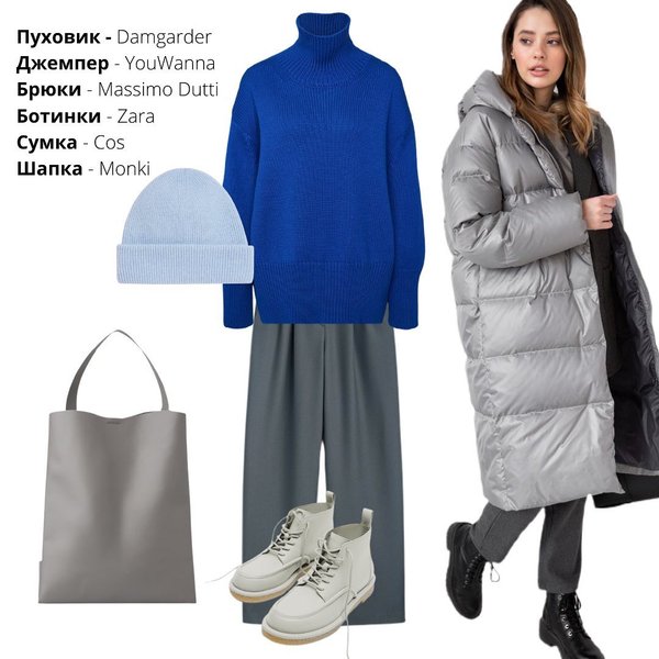 Як і у випадку з варіантом вище, під нього підійдуть і сукня, і штани. Платонова пропонує взяти легінси та трикотажну сукню, а на ноги — сірі замшеві черевики на тракторній підошві або короткі бурки на хутрі для вулиці. Образ завершать шапка великої в'язки та "дута" сумка-шопер.