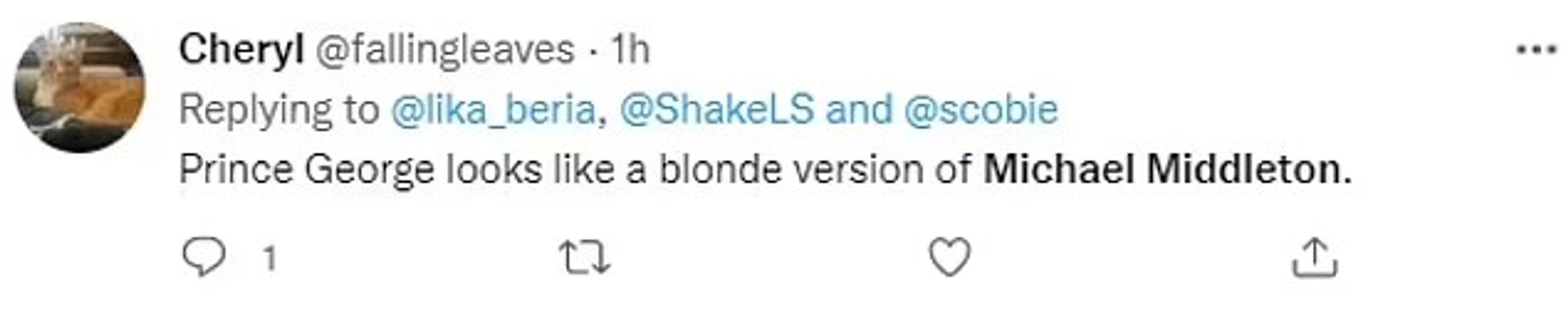 "На мою думку, зовні Джордж схожий на Ерла Спенсера та Майкла Міддлтона", — зазначив ще один користувач, додавши, що його сестра принцеса Шарлотта більше схожа на 39-річного принца Вільяма.