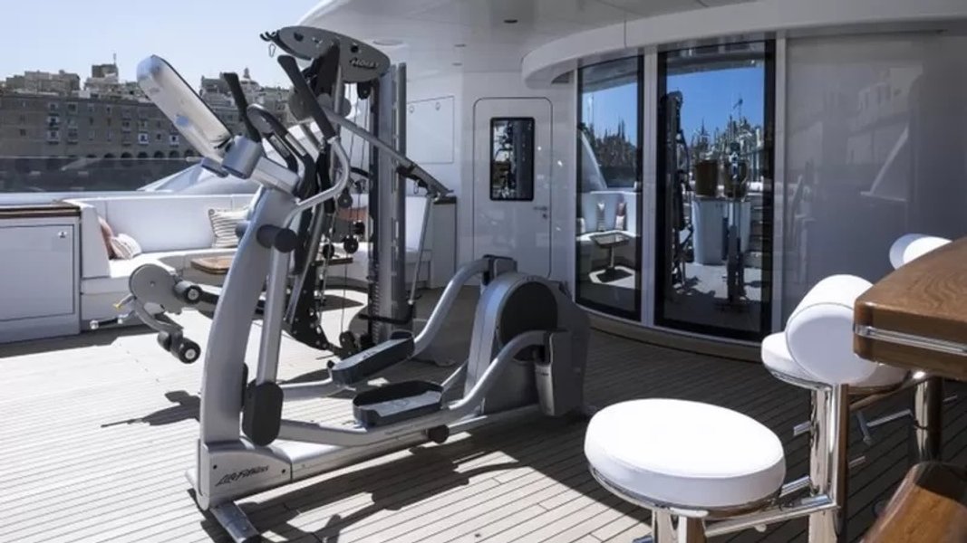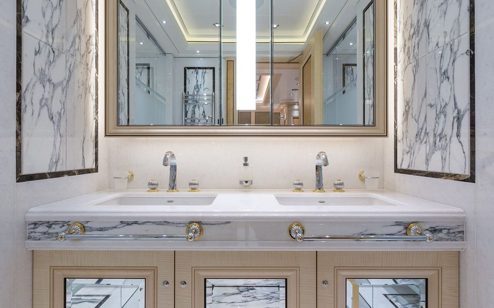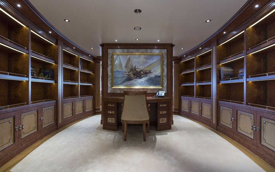 "Вишуканість" нехай і не дуже велика, але тут є аквадискотека — тобто басейн, який можна перетворити на танцпол, вертолітний майданчик, каюти, оздоблені білим мармуром і величезний офіс із бібліотекою.