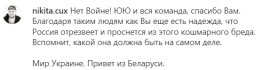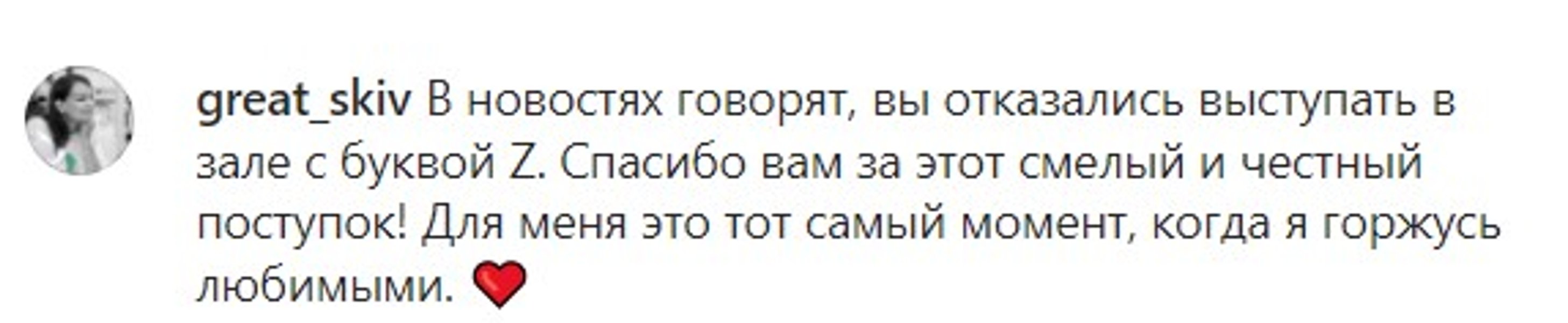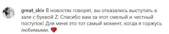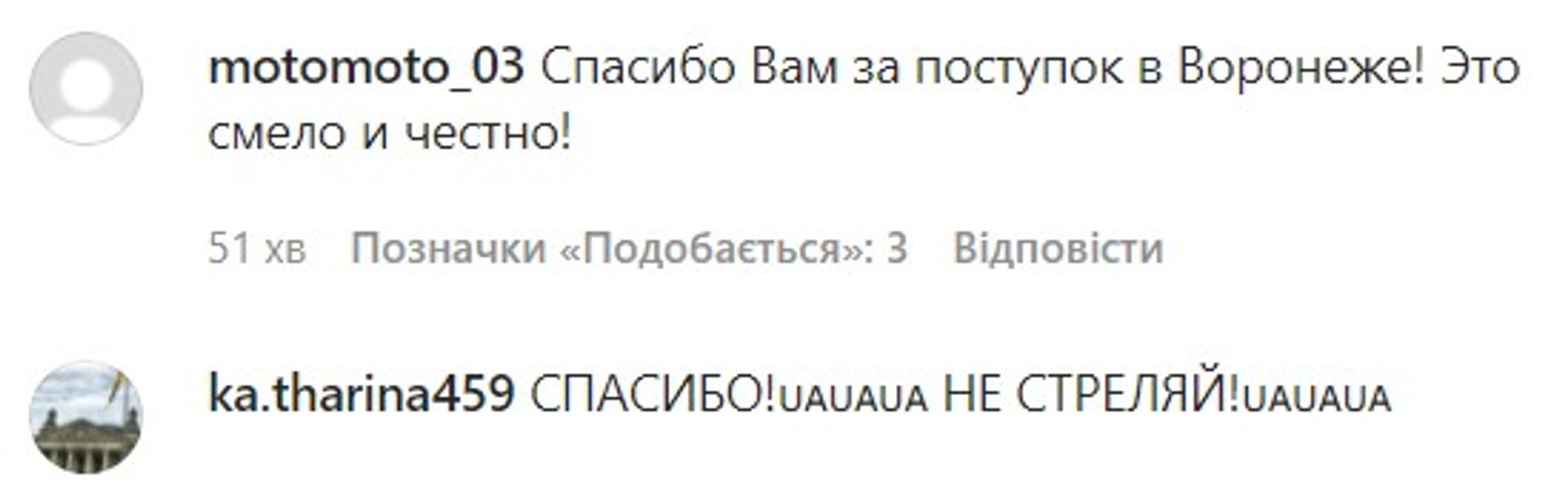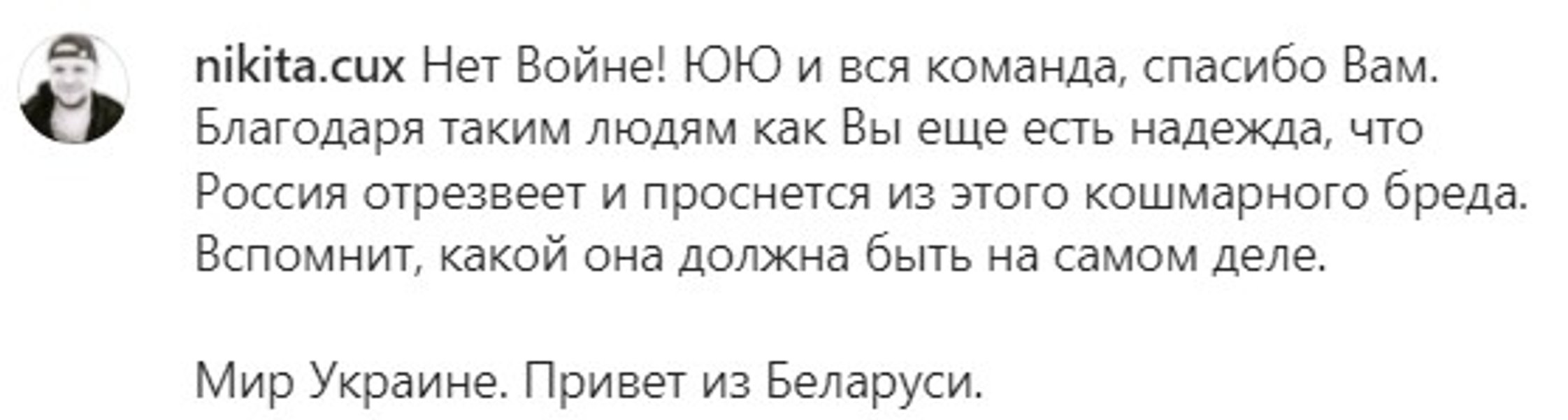 "Дякую, що були підтримкою багато років. А зараз, це просто життєва необхідність, щоб не збожеволіти", "Ні Війні! ЮЮ і вся команда, дякую Вам. Завдяки таким людям як Ви ще є надія, що Росія протверезіє і прокинеться з цього жахливого марення. Згадає, якою вона має бути насправді", "Я не знаю, щоб я відчувала і чи відчувала, якби ви всі промовчали…Дякуємо за те, що залишаєтеся людьми, за творчість у порожнечі…", "У новинах кажуть, ви відмовилися виступати в залі з літерою Z. Дякую вам за цей сміливий та чесний вчинок! Для мене це той самий момент, коли я пишаюся улюбленими", "Дякую Вам за вчинок у Воронежі! Це сміливо та чесно", — пишуть у коментарях.