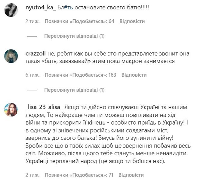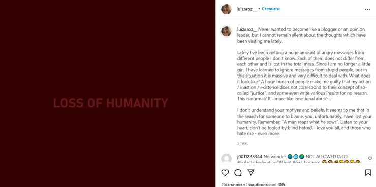 "Велика купа людей звинувачує мене в тому, що моя дія/бездіяльність/існування не відповідає їхньому поняттю так званої "справедливості", а деякі навіть пишуть різні образи без приводу. Це нормально? Це більше схоже на емоційне насильство... Я не розумію ваших мотивів" і переконань. Мені здається, що в пошуках винних ви, на жаль, втратили людяність. Пам'ятаєте: "Людина пожинає те, що посіяла". Слухайте своє серце, не ведіться на сліпу ненависть. Я всіх вас люблю, а тих, хто мене ненавидить — ще більше", — заявила дівчина.