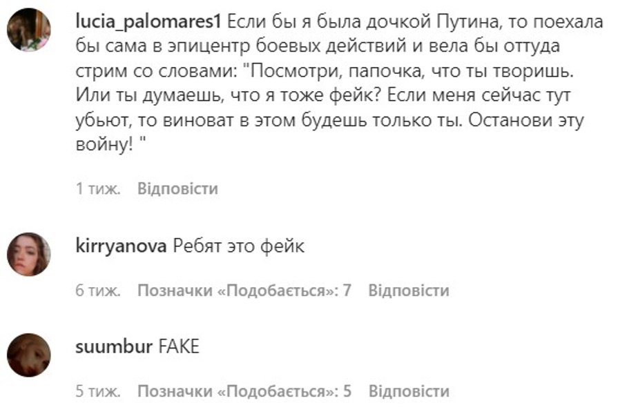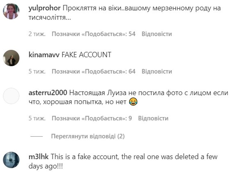 У коментарях спалахнула дискусія про те, що сторінка дівчини може бути зламана, і написане — не її рук справа. Тим більше, що, як повідомляли, Розова видалила сторінку. Інші ж, як і раніше, закликали Луїзу вплинути на батька та попросити його припинити геноцид в Україні.