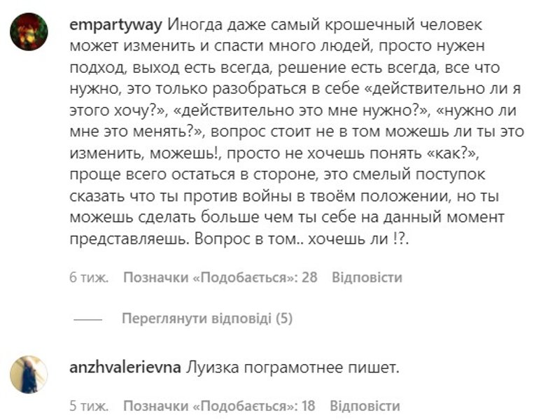 Завершуючи діалог із читачами, власниця аккаунта заявила, що надалі коментувати свою позицію вона ніяк не буде, оскільки вона й так зрозуміла.