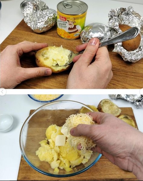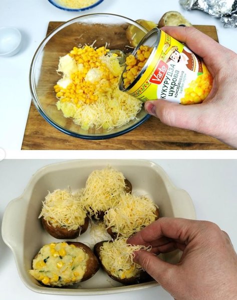 М'якуш картоплі змішайте в мисці з 50 г вершкового масла, 180 г тертого сиру, 150 г консервованої кукурудзи та петрушкою. Додайте сіль та перець до свого смаку.