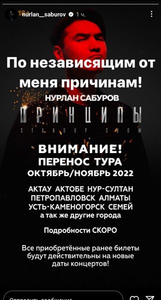 Тур російсько-казахського гумориста Нурлана Сабурова скасували в Казахстані. Про це 30-річний комік повідомив на своїй Instagram-сторінці.
