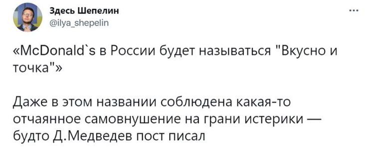Напередодні у Росії відкрилися кілька точок оновлених ресторанів мережі швидкого харчування McDonald's, який навесні 2022 остаточно пішов з ринку РФ. Заклади отримали "дуже схожий" на популярні бренди логотип та назву "Вкусно и точка". У мережі не пропустили таку подію повз та вже створили низку мемів.