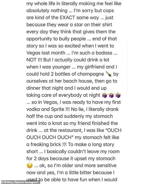 "Тим часом я чула, що мій тато щовечора ходив у бари… а мій брат їв свій салат із креветок, і пив джек із колою щовечора у Вегасі після мого виступу, а іноді й до нього!!!. Браян ніколи не дав б мені навіть ковток … Коли я просто йду зі сцени втретє за тиждень, і мої маленькі ніжки були на підборах, я підходжу до єдиного столу в своєму костюмі, і ви кажете мені, що ні… моє запитання: ЧОМУ???? Давайте поговоримо про це… це сильне почуття, яке тато відчував все моє життя, буквально змушуючи мене відчувати себе абсолютно нічим… Вибачте, але копи поводяться ТОЧНО так само… тільки тому, що вони носять зірку на сорочці щодня, вони думають, що це дає їм можливість залякувати людей", — розійшлася зірка.