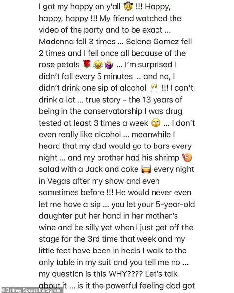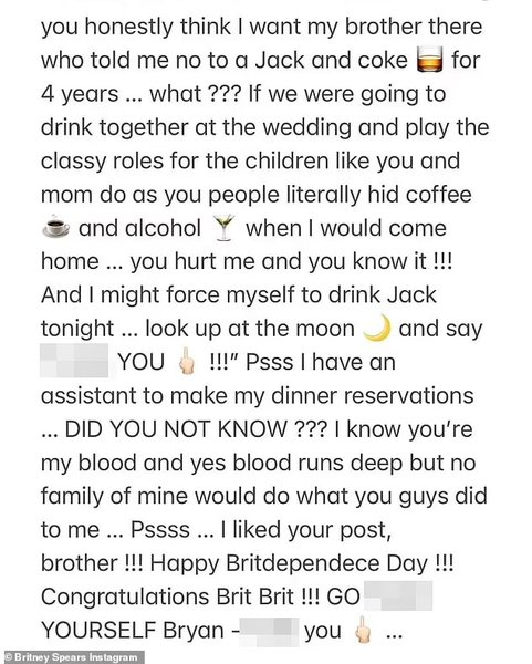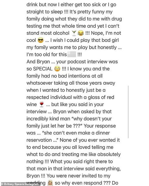 Перед тим, як деактивувати аккаунт цього разу, Брітні видала публіці великий допис, в якому стверджувала, що "ніколи не запрошувала" свого старшого брата Браяна Спірса на церемонію, а також накинулася на батьків і сестру через їхнє поводження з нею в роки опікунства. Вона згадала той факт, що "не випила ні ковтка алкоголю" у свій особливий день, тому що протягом останніх 13 років вона "перевірялася на наркотики не менше трьох разів на тиждень", і їй ніколи не дозволяли пити.
